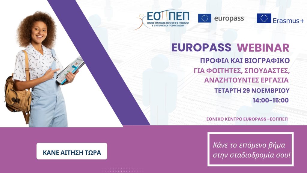 Το Εθνικό Κέντρο Europass- ΕΟΠΠΕΠ σας προσκαλεί στο webinar με τίτλο: “Προφίλ και βιογραφικό για φοιτητές, σπουδαστές και αναζητούντες εργασία” το οποίο θα πραγματοποιηθεί την Τετάρτη 29 Νοεμβρίου 2023, στις 14.00 – 15.00 μ.μ. διαδικτυακά στο Teams.